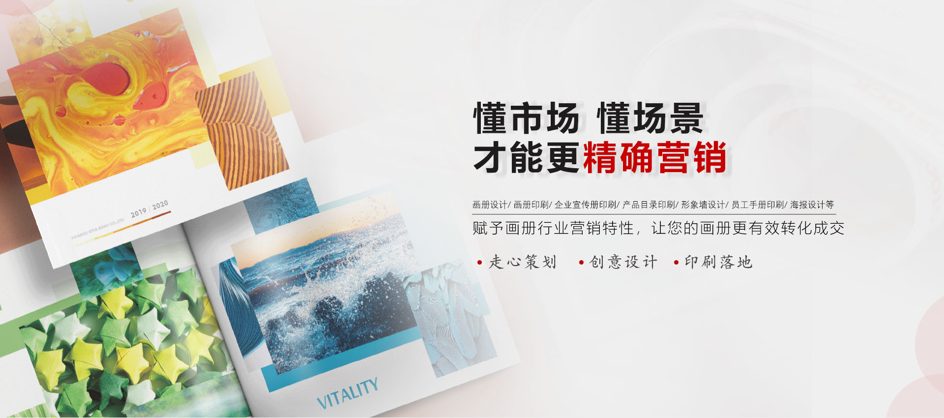 根據客戶的企業文化,市場推廣策略合理安排畫冊(印刷品)畫面的三大構成關系和畫面元素的視覺關系使達到企業品牌和產品廣而告之的目的。